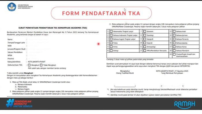 Pengembang Penilaian Pendidikan Ahli Pertama Kemendikdasmen, Suryo Atmojo dalam Webinar Strategi Cerdas: Pemilihan Mapel, Pendataan, dan Manfaat TKA dalam SNBP, Jumat (19/9/2025) lalu dikutip dari YouTube Direktorat SMA menjelaskan pendaftaran TKA tidak dilakukan secara mandiri oleh murid.